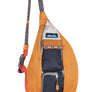 Mini sling pack with adjustable rope shoulder strap and side release buckle, elastic webbing keeper at strap end, two key or cell phone pockets with pattern webbing detail, exterior back zip pocket, interior d-ring key chain loop, padded back with KAVU embroidery.