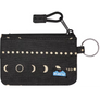 Double sided wallet with metal key ring, zip compartment with ID window and rope loop zip pull.